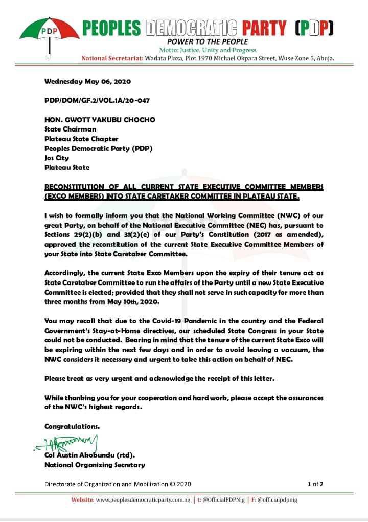 This decision was contained in a letter addressed to the State Chairman of the Party, Hon. Gwott Yakubu Chocho dated 6th May, 2020 duly signed by the National Organizing Secretary, Col. Austin Akobundu (Rtr).
