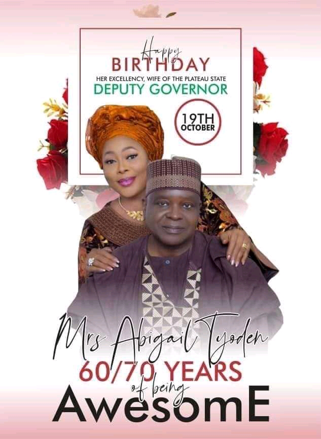 The Central Planning Committee for the 70th and 60th joint birthday celebration of the Deputy Governor of Plateau State, His Excellency Professor Sonni Gwanle Tyoden and his wife, Her Excellency Mrs Abigail Tyoden hereby announces the postponement of all activities lined up for the occasion. These are namely the Public Lecture and Biography Presentation ”Professor Sonni Gwanle Tyoden : Tenacity of Life in Leadership” and the Banquet on Saturday, 24th October and the special Thanksgiving Service on Sunday 25th October respectively.