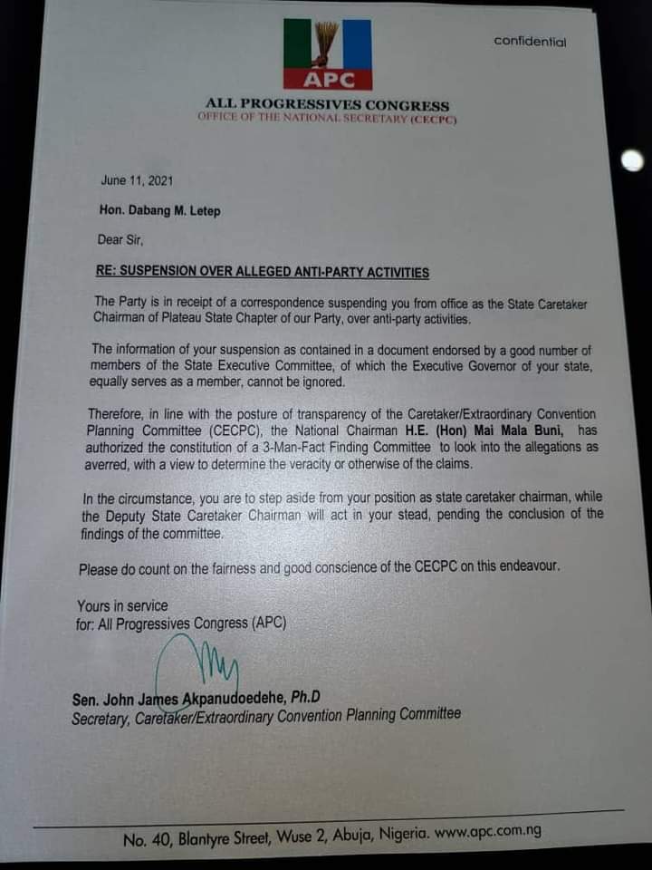 The relative quiet within the ruling All Progressives Congress (APC) in Plateau State seems to have come to an end with the recent letter address the Hon Letep Dabang, the State Chairman of the Party, dated June 11th 2021. According a letter signed by the Nation Secretary of the Nation Caretaker Extraordinary , Hon Letep who had served his term a elected Chairman of the APC in Plateau until the recent dissolution by the Nation Executive Council of the Party, converting him to a State Caretaker Committee Chairman along side other counterparts from all states of the federation, is suspended on allegation including but not limited to what the party described as “Anti- Party activities”.