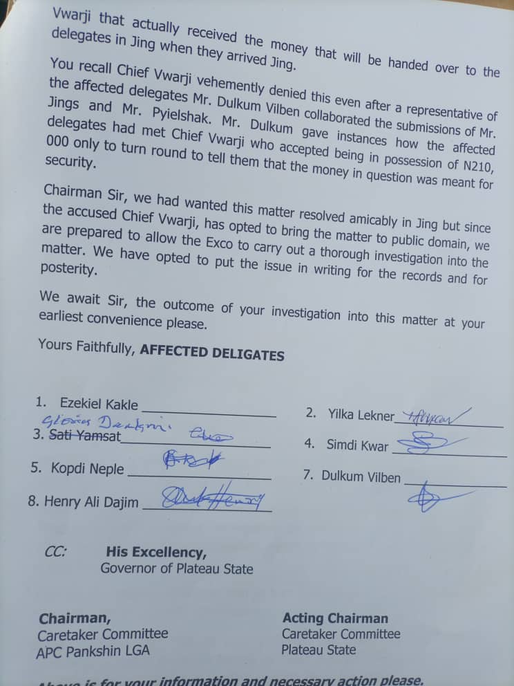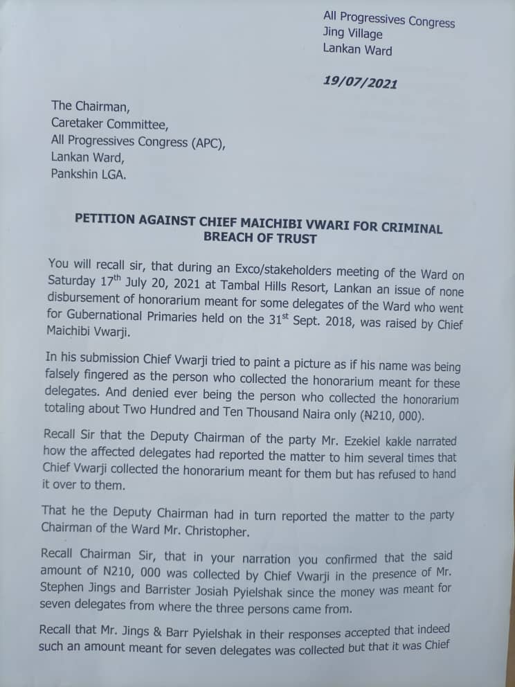 In a letter of petition dated 19th July, 2021 addressed to the APC Caretaker Committee Chairman Pankshin LGA titled “Petition Against Chief Maichibi Vwarji For Criminal Breach of Trust”, the delegates accused the APC Chieftain of diverting the sum of Two Hundred and Ten Thousand Naira (N210,000) meant for them which he collected but has not been disbursed to them since 2018.