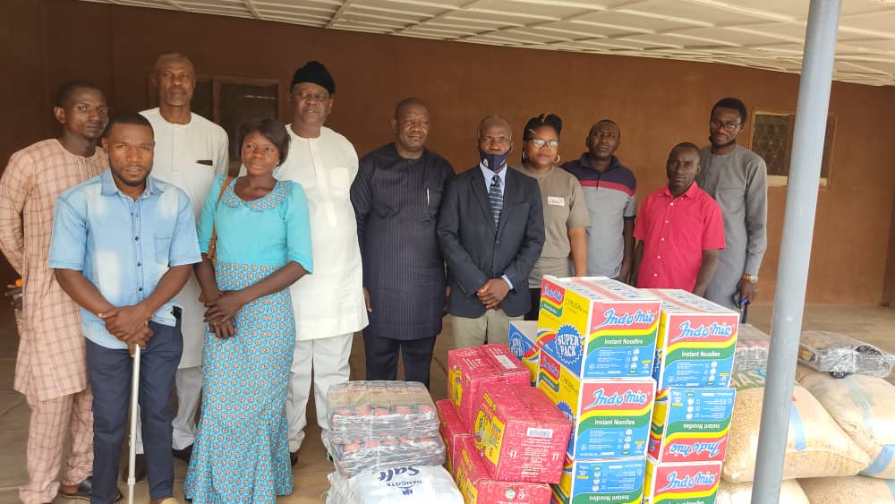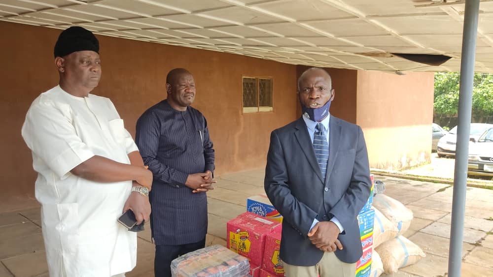 Items donated include bags of maize, cartons of indomie, cartons of spaghetti, cartons of Maggie and salt.