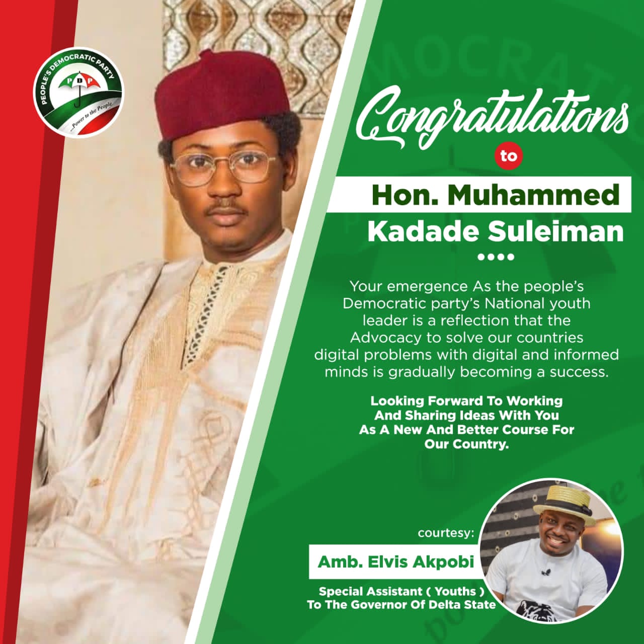 The Special Assistant to the Delta State Governor on Youth Development, Ambassador Elvis Akpobi has congratulated Hon Muhammed Kadade Suleiman on the occasion of his inauguration as the substantive National Youth Leader of the Peoples Democratic Party (PDP).