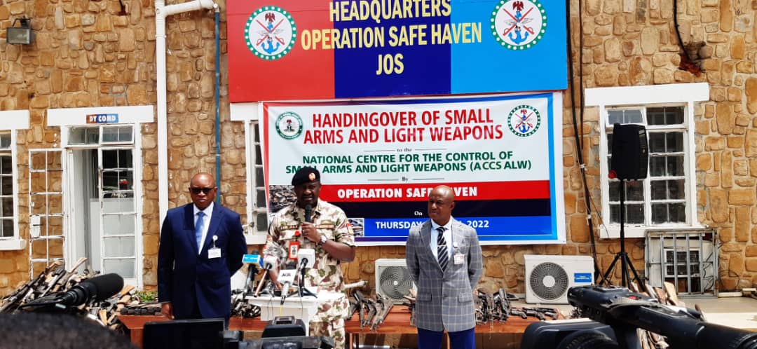The Military Special Task Force code named ‘Operation Safe Haven’ has recovered small arms and light weapons numbering five hundred and seventeen (517). This was disclosed in a ceremony organized by the Commander Operation Safe Haven/GOC 3 – Division, Major General IS Ali at the Headquarters of Operation Safe Haven in Jos, where the recovered weapons were handed over to the North Central Coordinator of the National Center for the Control of all Arms and Light Weapons Major General H. I Bature (Rtd) on Thursday 21th April 2022.