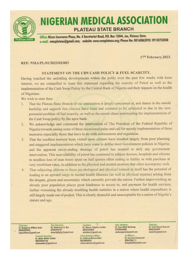 In a statement jointly signed by the State Chairman Dr Bapigaan William Audu and Secretary Dr Lukden Mawun Stephen respectively, association noted that “Having watched the unfolding developments within the polity over the past few weeks with keen interest, we are compelled to issue this statement regarding the scarcity of Petrol as well as the implementation of the Cash Swap Policy by the Central Bank of Nigeria and their impacts on the health of Nigerians.”