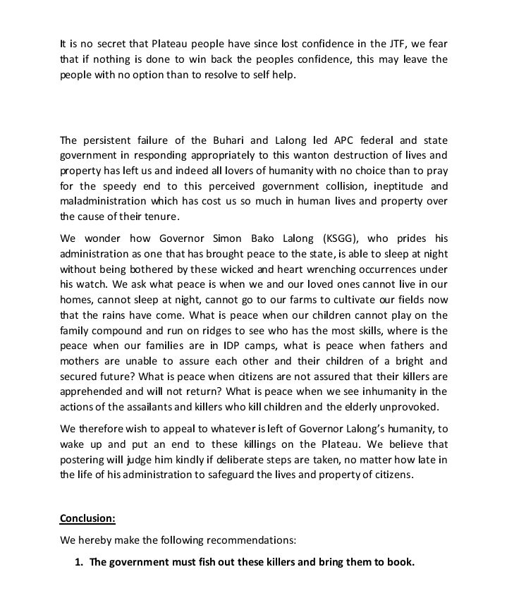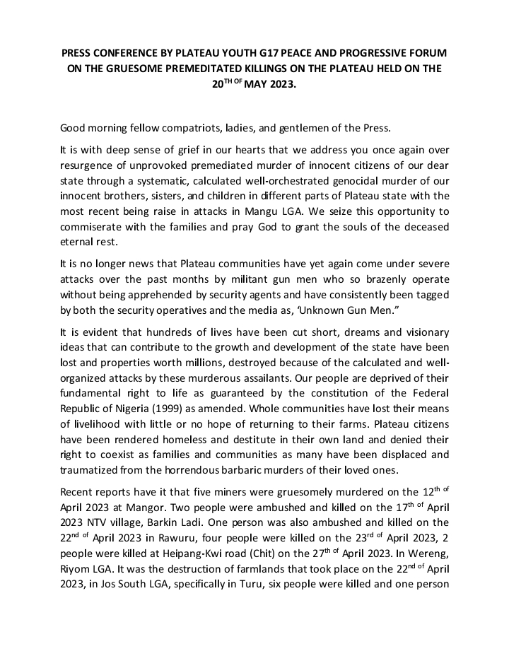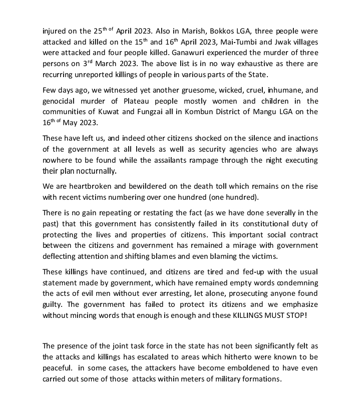 They also revealed that “Recent reports have it that five miners were gruesomely murdered on the 12th of April 2023 at Mangor. Two people were ambushed and killed on the 17th of April 2023 NTV village, Barkin Ladi. One person was also ambushed and killed on the 22nd of April 2023 in Rawuru, four people were killed on the 23rd of April 2023, 2 people were killed at Heipang-Kwi road (Chit) on the 27th of April 2023”.