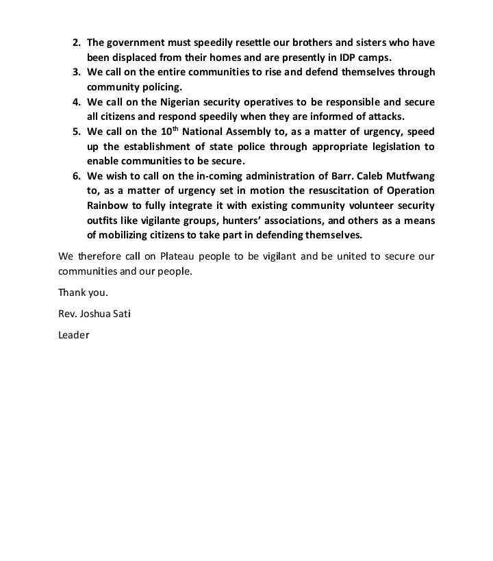 They therefore called on Plateau people to be vigilant and be united to secure communities and lives.