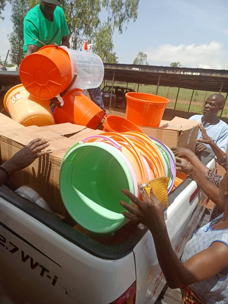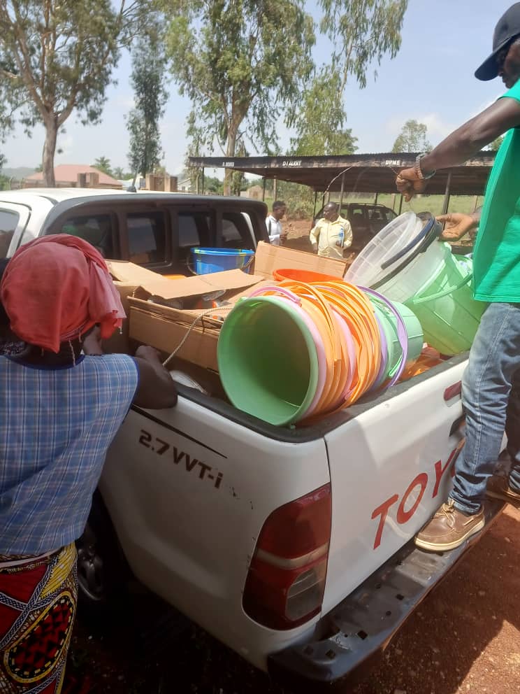 Jerry-cans for water storage, 10 units of Drinking Water Jugs and 22 units of drinking cups, 5000 tablets of Chlorine for water purification at storage points, 10 Brooms, 10 Packers, 40 copies of