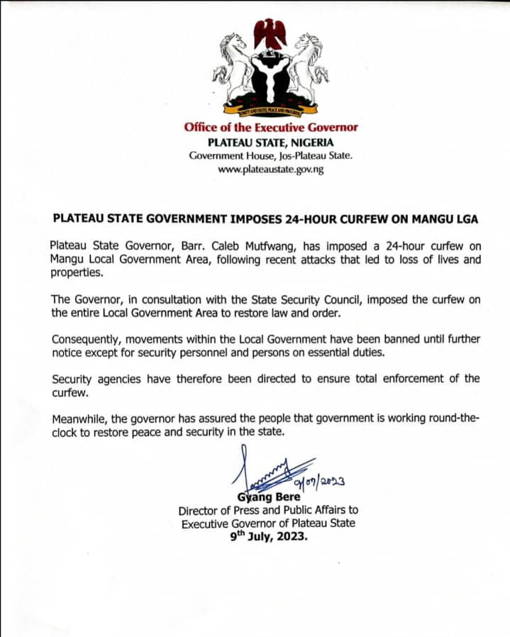The Executive Governor of Plateau State Barrister Caleb Manasseh Mutfwang has imposed a 24 hours Curfew in Mangu LGA follow fresh attacks in Sabon Gari community of the area. In a statement issued by the Director of Press and Public Affairs to the Governor Gyang Bere, this was done in consultation with Security Chiefs in the State.