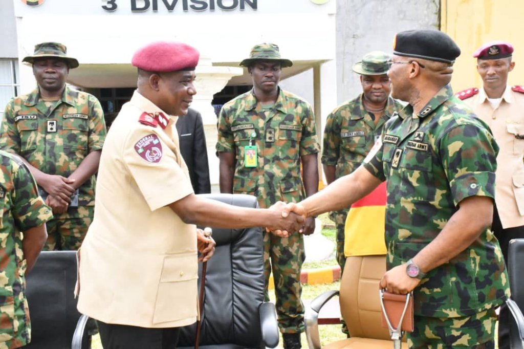 The General Officer Commanding (GOC) 3 Division Nigerian Army (NA) and Commander Operation SAFE HAVEN (OPSH), Major General AE Abubakar has reiterated that 3 Division will continue to partner with the Federal Road Safety Corps towards ensuring maximum safety on highways. He made this known today 4 August 2023, when the Zonal Commanding Officer Federal Road Safety Corps, Assistant Corps Marshal Clement O Oladele paid a courtesy visit to Headquarters 3 Division Jos.