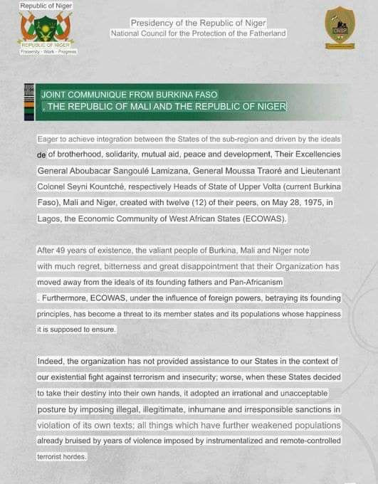 Breaking: Burkina Faso, Mali and Niger Quit ECOWAS Nigeria Star NewsJanuary 28, 2024Politics Post navigation PreviousNext Share this: Click to share on X (Opens in new window) X Click to share on Facebook (Opens in new window) Facebook Like Loading...